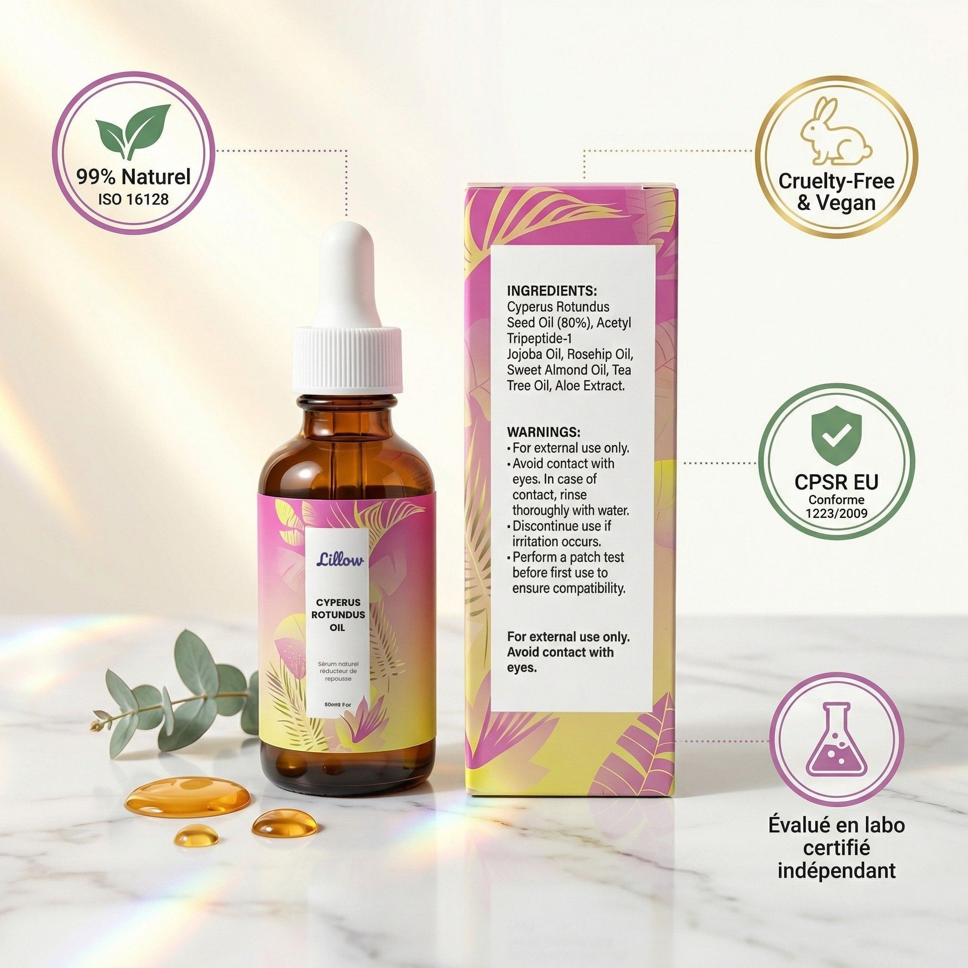 L'extrait de Cyperus Rotundus est absorbé en profondeur par votre peau, atteignant les follicules pileux directement à la racine, là où la croissance du poil commence.
