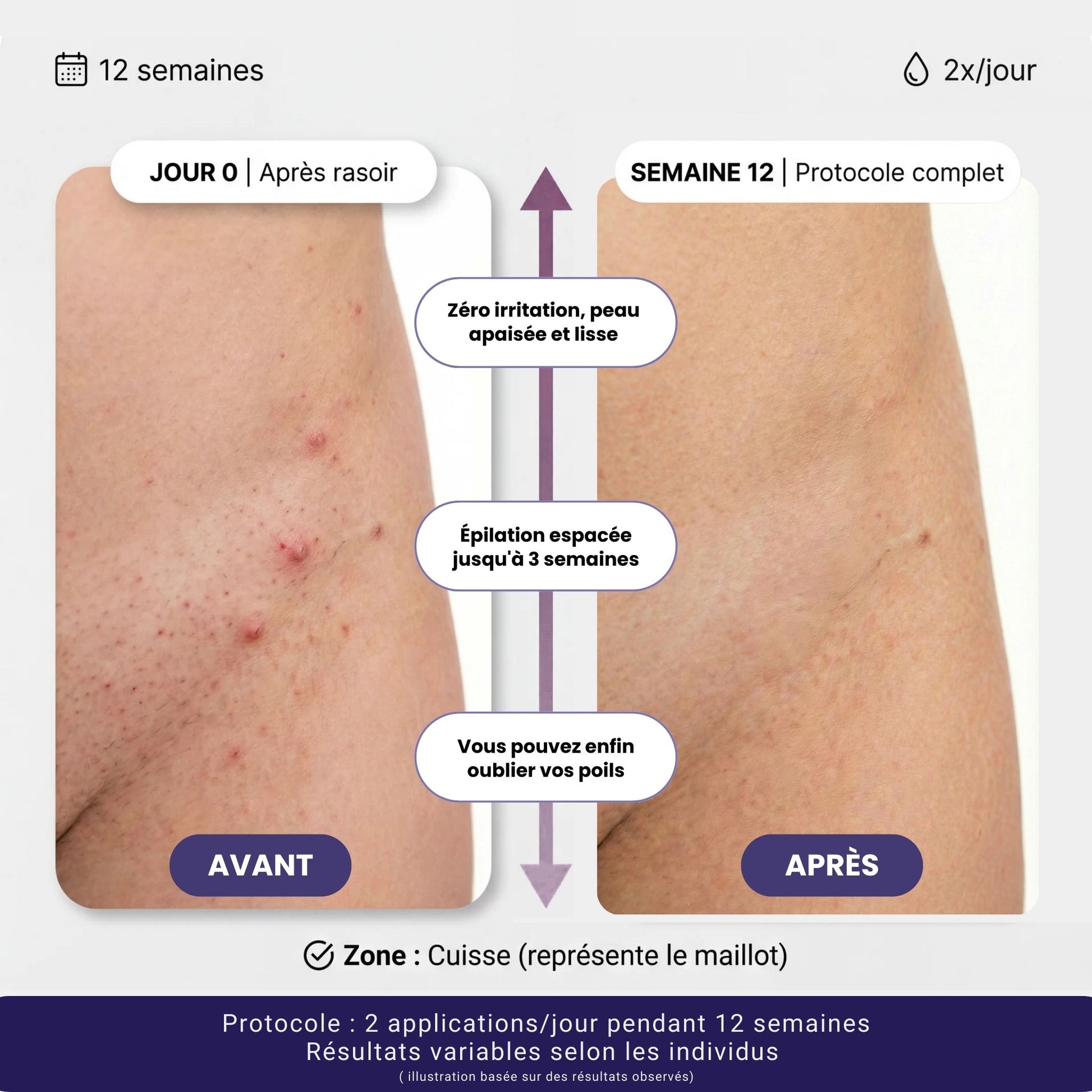 Formulé scientifiquement pour cibler et réduire la repousse des poils indésirables.
